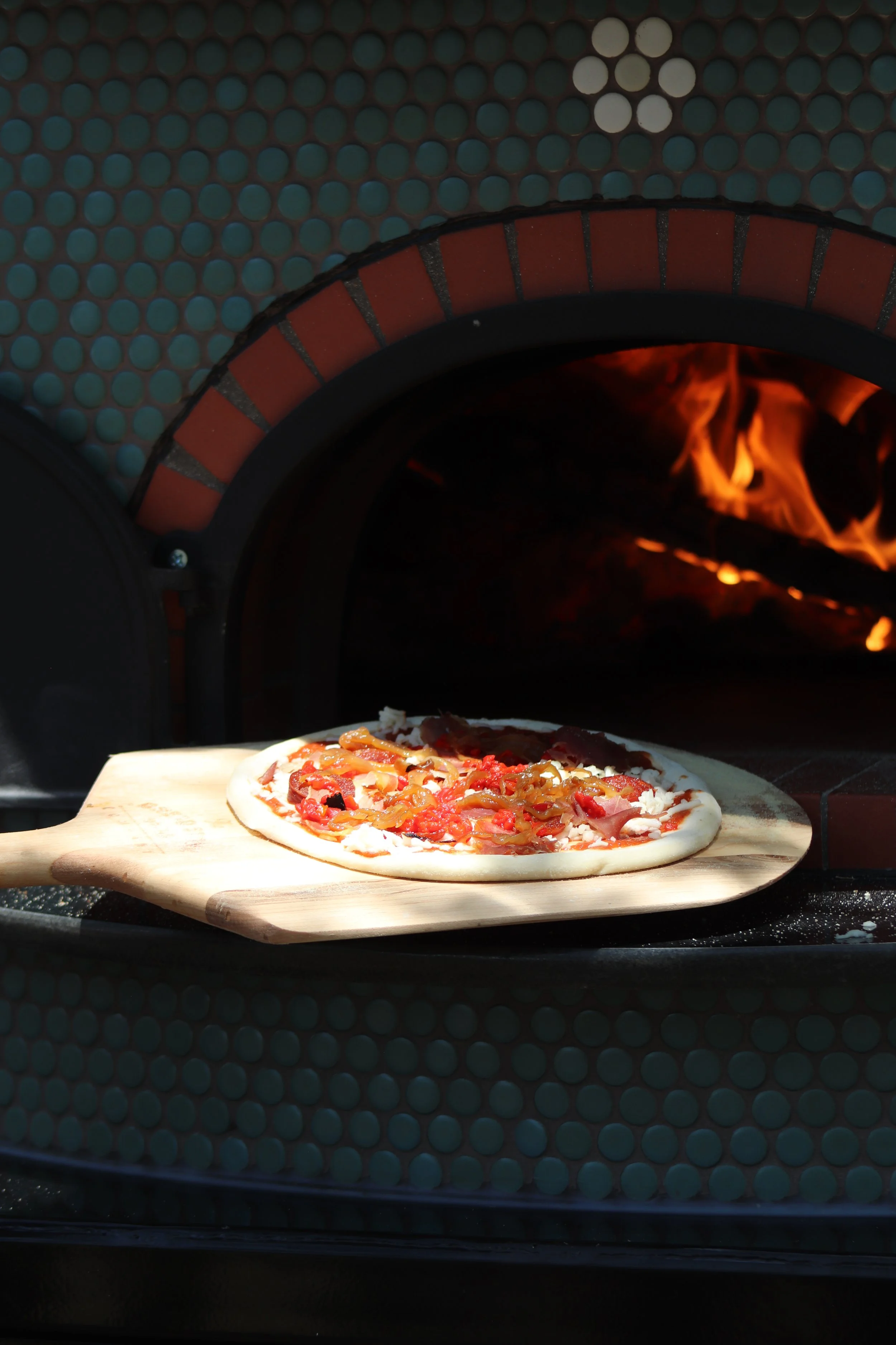 spanish chorizo, pizza sauce, jamón serrano, caramelized onion, piquillo peppers, red cerignola olive, mozzarella